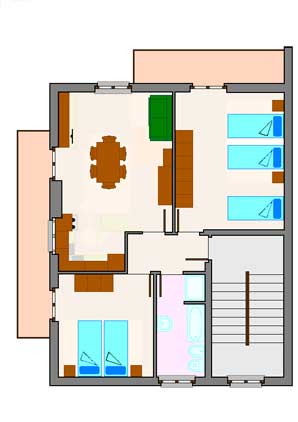 L’appartamento è composto da cucina-soggiorno con divano letto matrimoniale, 2 stanze da letto (4 posti letto), bagno con vasca/doccia, balcone e giardino.