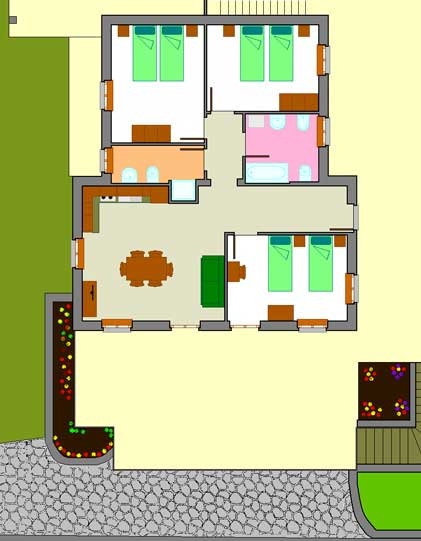 L’appartamento è composto da cucina-soggiorno con divano letto matrimoniale, 3 stanze da letto (6 posti letto), 2 bagni (1 con vasca e 1 con doccia), grande terrazzo-solarium con sdraio ed ombrellone.