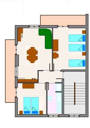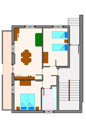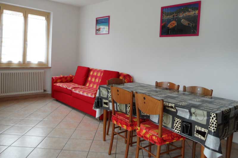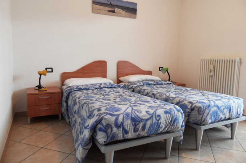 L’appartamento è composto da cucina-soggiorno con divano letto matrimoniale, 2 stanze da letto (4 posti letto), bagno con vasca/doccia, balcone e giardino.